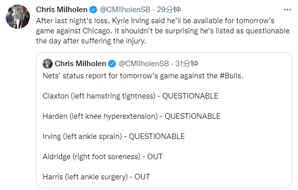 上一场篮网输球还有坏消息,欧文的左脚踝被压伤——末节利特尔鱼跃扑抢地板球,压到了欧文的脚踝,之后欧文重新绑紧鞋带,继续留在场上;赛后欧文表示自己的伤势无碍,并且确认可以出战与公牛的比赛;现在篮网宣布欧文因左脚踝扭伤而出战成疑,50%可能性出战公牛。