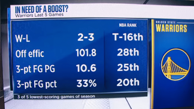 勇士目前状态低迷,确实非常需要汤普森能复出减压。ESPN晒出了勇士近5战的数据,2胜3负,是同期联盟第16位的表现,进攻效率101.8,联盟第28位,场均三分命中数10.6个,联盟第25位,三分命中率33%,联盟第20位。勇士赛季得分最低的5场比赛,有3场出现在这段区间。