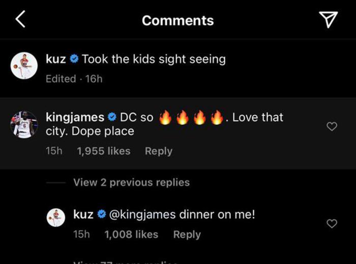 之前,有许多美国的八卦媒体更是对于詹姆斯和库兹马二人之间的关系产生了猜测,更有甚者认为,詹姆斯已经和库兹马二人决裂了。可是,在库兹马离开洛杉矶之前,詹姆斯和前队友杜德利还特意为小马哥举办了欢送会,一举打消了这些质疑。之后,库兹马在一档面对面的采访节目之中更是表达了自己对于詹姆斯的敬意,他认为,詹姆斯是一位非常伟大的队友,而且他们二人经常会在社交媒体上互相调侃、问候,关系格外地融洽。因此,那些有关库兹马与詹姆斯不和的传闻就慢慢地烟消云散了。