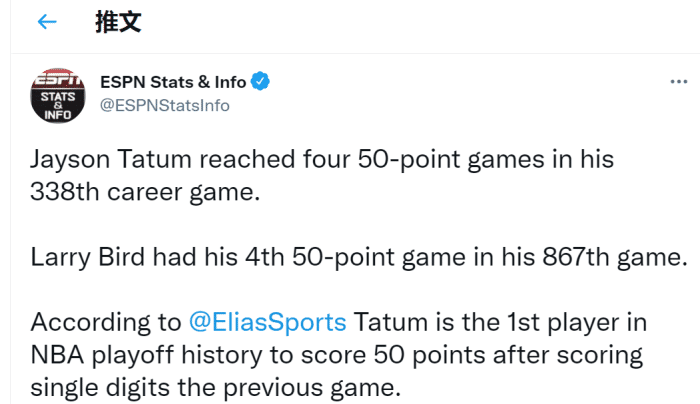 第六,据ESPN统计,塔图姆只用了338场比赛就砍下生涯第4次50+,而拉里伯德用了足足867场!塔图姆成为季后赛历史第一位在上一场得分没有上双(G2只有9分)的情况下紧接着砍下50分的球员!