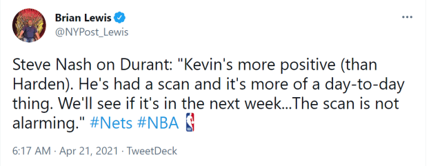 JRS直播网讯 北京时间4月21日,篮网遭遇重创,哈登在康复训练时腿筋伤势复发,核磁共振检查后,篮网宣布他将无限期休战。名记沃纳罗斯基报道称,消息源透露,哈登可能要等到季后赛开战左右才能复出。对于篮网而言,好消息是杜兰特的伤势并无大碍,纳什透露了他预计的回归时间。