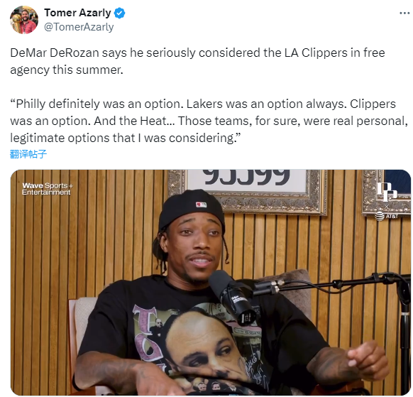 JRS直播网讯 北京时间9月10日,国王新援德马尔-德罗赞透露,今年夏天他认真考虑过加盟湖人、快船等队;在做客保罗-乔治的节目,德罗赞表示:我考虑了费城。费城绝对是个选择,湖人一直都是个选择,快船也是个选择,还有热火。这些球队,都是我考虑过的真正个人、切实的选择。