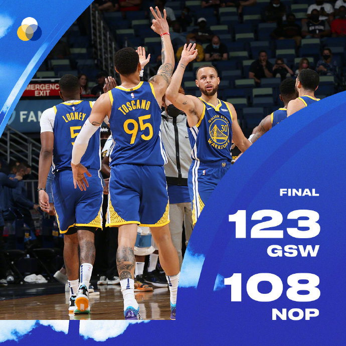 JRS直播网5月4日讯 鹈鹕今日坐镇主场迎来勇士的挑战,勇士凭借上一场大胜火箭的胜利及时止住颓势并继续追赶季后赛末班车,鹈鹕目前无欲无求不过近期4战3胜表现相当不错。首节之争勇士多点开花用一波12-1的攻势拿到完美开局,节中面对鹈鹕的追赶,“库三节”的主导者将火热手感提前至首节,库里这一节轰下17分,勇士节末再送18-7的攻势确立起18分领先,次节勇士仍然主导比赛,次节打完11分钟的时候仍然手握20分的领先,不过鹈鹕最后时刻自我救赎,他们依靠一波8-0的攻势将分差缩小至12分进入下半场。休息归来面对鹈鹕的反扑,“库三节”从不迟到,库里这一节再度轰下15分并送出3次助攻,勇士从优势一度被缩小至6分的情况下重新拉开两位数领先牢牢控制比赛。末节维金斯站出来连拿8分为勇士奠定一个好头,勇士稳守巨大领先没有给鹈鹕任何机会。最终,勇士客场大胜鹈鹕拿下比赛。