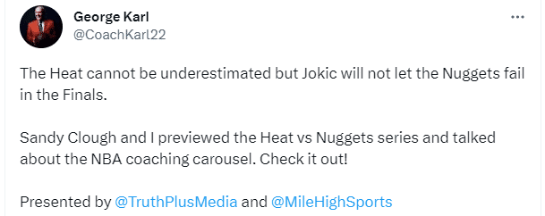 NBA前名帅乔治-卡尔发推写道:热火不能被低估,但约基奇不会让掘金在总决赛中落败!我是巴姆(阿德巴约)的超级球迷,我认为总决赛他能在进攻端打出一个亮眼表现,但在防守端,我认为他将非常艰难,他绝对会被约基奇打爆!
