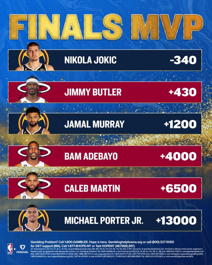 JRS直播网讯06月01日,NBA最新总决赛MVP赔率出炉,约基奇位居榜首并且大幅度领先,巴特勒第二,热火东决抢七晋级的大功臣马丁上榜。