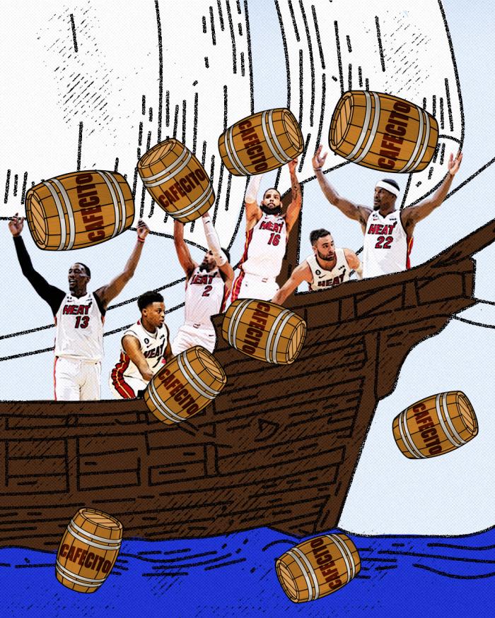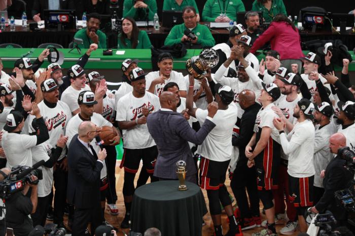 在东部冠军颁奖仪式上,阿德巴约率先举起东部冠军奖杯(鲍勃-库西杯),之后他想把奖杯递给巴特勒,不过巴特勒并不想捧起这座奖杯,拒接后告诉阿德巴约:我来拿下一个(指总冠军奖杯)。