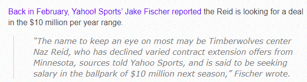 本赛季,纳兹-里德的年薪是193万美元,为森林狼出战68场常规赛,场均出战18.4分钟可以拿下11.5分4.9篮板1.1助攻;里德今年23岁,身高2米06体重113公斤,是一名技术性大个子球员,湖人有意里德,应该想为浓眉找替补中锋。