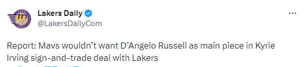 今年休赛期,湖人队的首要任务是留住受限制球员里夫斯和八村垒,这两笔续约将让湖人更难以裸签其他球星;湖人想用拉塞尔换欧文,可拉塞尔没什么交易价值(据此前报道,拉塞尔不会回归湖人,湖人拒绝和他提前续签2年6750万美元合同),独行侠更不想送走欧文却换来一个低配版的欧文,今夏欧文最高可以和独行侠续签5年超2.7亿美元的顶薪合同。