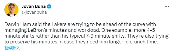 哈姆确定詹姆斯出战森林狼,并且表示:我们正尝试就詹姆斯的出场时间做出一些调整,以前詹姆斯一般是在打了7-9分钟后下场休息,未来可能会更多地让他在打4-5分钟后就休息一下。我们还会考虑尽量以控制出场时间的方式让他保留体力,以备在比赛关键时刻他需要长时间出场。