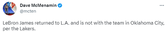 JRS直播网讯03月02日,詹姆斯、浓眉和拉塞尔三大主力都因伤缺战雷霆,据报道,詹姆斯已经提前返回洛杉矶,暂时离开球队,未随队前往俄城。