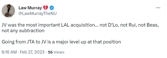 洛杉矶记者Law Murray在社媒上写道:“JV(范德比尔特)是湖人最重要的引援……不是拉塞尔,不是八村垒,不是比斯利,不是其他任何人。把托斯卡诺-安德森升级为范德比尔特,让湖人的那个位置提升了一个档次。”