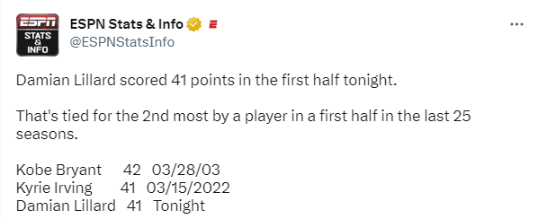 3、利拉德上半场41分创NBA有单节数据统计(1996-97赛季)以来的上半场第二高分,追平欧文仅次于科比的42分