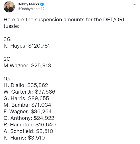据薪资专家Bobby Marks统计,这次禁赛使这11人共计损失大约52.6万美元:海耶斯禁赛3场 损失12万;大瓦格纳禁赛2场 损失2.6万;迪亚洛禁赛1场 损失3.6万;卡特禁赛1场 损失9.7万;加里-哈里斯禁赛1场 损失8.9万;班巴禁赛1场 损失7.1万;小瓦格纳禁赛1场 损失3.6万;科尔-安东尼禁赛1场 损失2.5万;PJ汉普顿禁赛1场 损失1.7万;斯科菲尔德禁赛1场 损失3510;凯文-哈里斯禁赛1场 损失3510。