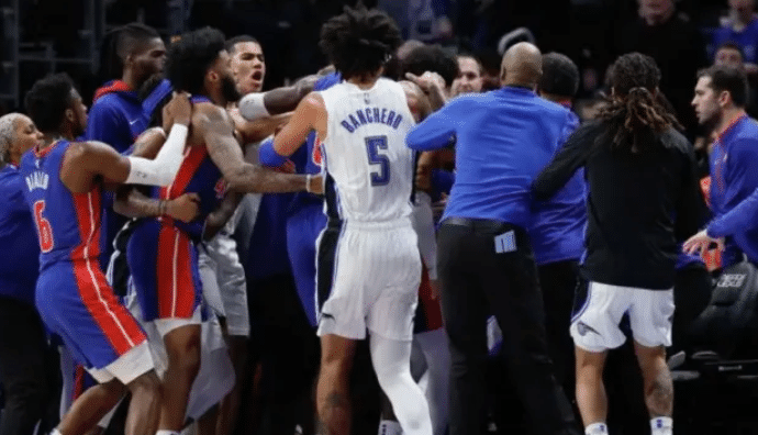 在魔术和活塞上半场最后时刻,两队拼抢球权时,大瓦格纳使坏撞倒海耶斯,迪亚洛第一时间冲过来,从背后推搡大瓦格纳,海耶斯起身后报复大瓦格纳,一记重拳打到瓦格纳的后脑勺,两队多名球员围过来,现场十分混乱,魔术多名球员违规离开替补席,险些在活塞替补席引发围殴。