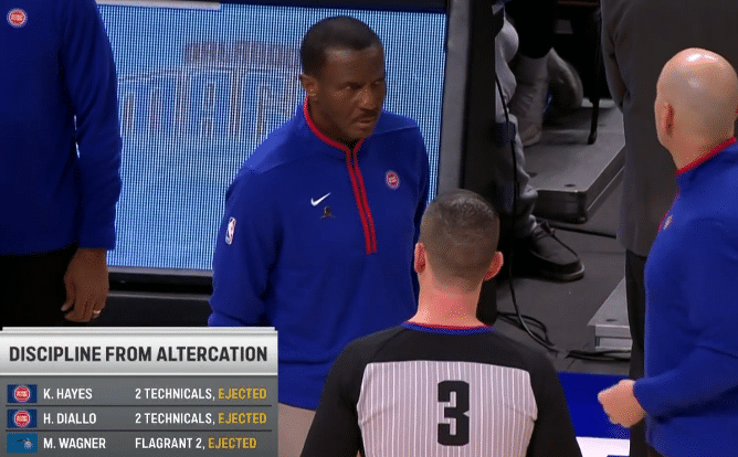 裁判回放之后,最终吹罚莫瓦格纳二级恶意犯规直接驱逐,海耶斯和迪亚洛都连续吃到两个技术犯规被驱逐离场,累计三名球员被驱逐。