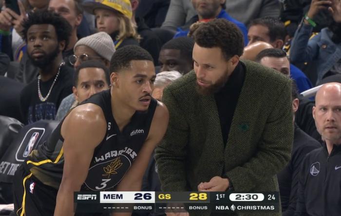 JRS直播网12月26日讯 ,NBA年终大战勇士对阵灰熊,库里因左肩半脱位的伤势而缺席比赛,库里身穿便装坐在场边观战,期间库里化身库指导,勇士领袖指导普尔一幕引热议。