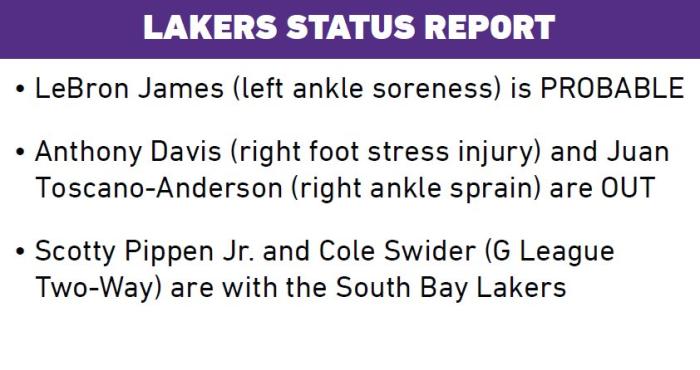 JRS直播网12月25日讯 ,湖人官方公布年终大战对阵独行侠的伤情报告,詹姆斯(左脚踝酸痛)大概率带伤出战,浓眉(右脚应力性损伤)、托斯卡诺-安德森(右脚踝扭伤)缺席比赛,小皮蓬和斯威德都仍旧在发展联盟,继续为南湾湖人效力。