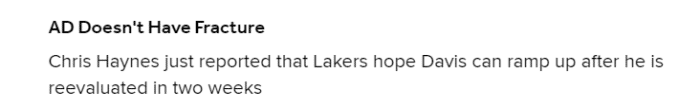JRS直播网12月24日讯 ,湖人官方正式宣布浓眉因右脚应力性损伤而无限期休战,浓眉伤势令人担忧,之后BR记者克里斯-海耶斯报道,浓眉的右脚没有骨折,他现在的感觉很好,浓眉将会在2周后接受复查,若恢复顺利,到时他可以为复出而加强训练强度。