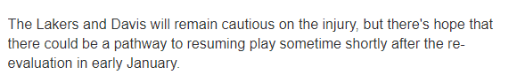 名记woj表示在过去几天浓眉脚部的疼痛已经消退,预计再休息7-10天,湖人将再次评估他能否回归;湖人和浓眉对待伤病都十分谨慎,浓眉希望通过休息来恢复伤病,他相信自己能够康复,浓眉有望在1月初评估后回归赛场。