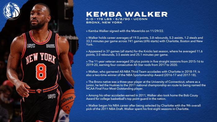 今年休赛期,沃克被尼克斯交易到活塞,由于他与活塞没有达成买断协议,最终沃克被活塞裁掉;上赛季,沃克为尼克斯打了37场比赛,场均拿到11.6分3.5助攻3篮板,曾单场狂砍44分9篮板8助攻,无奈仍遭锡伯杜弃用;如今沃克正式加盟独行侠再就业,助东契奇冲击总冠军。