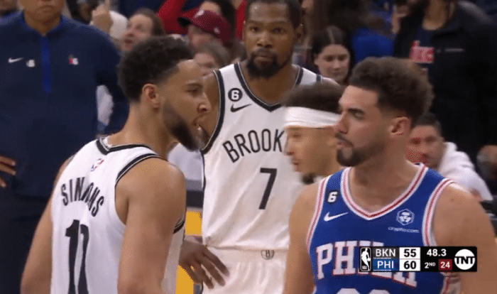 第二节,尼昂在防守时肘击西蒙斯的腹部,本西痛苦地跑到场边,裁判回放之后吹罚尼昂一级恶意犯规;西蒙斯两罚一中,尼昂仍旧不满判罚,之后西蒙斯和前队友激烈互喷,杜兰特站在一旁看热闹。