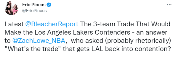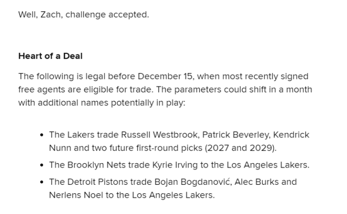 名记扎克-洛维列出的三方交易方案是湖人送走威少、贝弗利、纳恩和两个首轮选秀权(2027年和2029年首轮签),篮网把欧文送到湖人,活塞把博扬达诺维奇、伯克斯和诺尔交易到湖人,