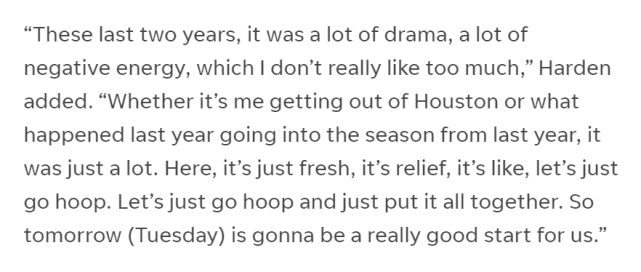 现在的76人,让哈登感受到很好的氛围,这也是他喜欢的。哈登表示:“过去两年,我身边有很多戏剧性的事情发生,很多负能量,我不大喜欢这些,无论是我离开休斯顿,还是去年发生的那些事。而在这里,我很放松,就像只要去打篮球就行了。”