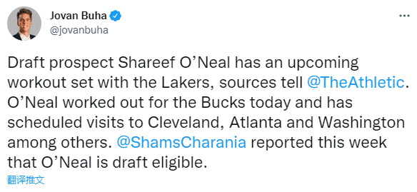 JRS直播网06月10日讯 据洛杉矶记者Jovan Buha报道,消息人士透露,NBA名宿奥尼尔之子沙里夫-奥尼尔计划参加湖人试训,今日沙里夫将为雄鹿试训,并计划前往克利夫兰、亚特兰大和华盛顿等地参加试训。