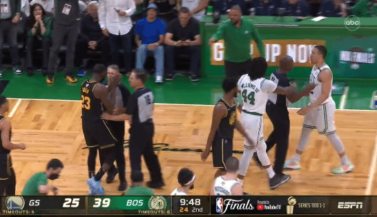 JRS直播网06月09日讯 ,勇士和凯尔特人总决赛G3,第二节场上险些发生冲突,格林和格威互喷垃圾话,所幸及时被劝阻拉开,双方都没有吃到技术犯规,这比赛打得真是火药味十足。