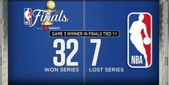 目前勇士和凯尔特人打成1-1平,G3是关键一战,据统计,NBA总决赛历史共出现过39次1比1的平局,拿下第三战的球队32次夺冠,7次屈居亚军。
