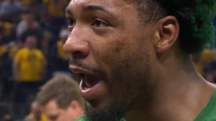 JRS直播网06月04日讯 昨天凯尔特人客场15分逆转勇士,从而拿下总决赛G1,今日NBA官方晒出斯玛特激情训话一幕,告诉队友要防出去,故意让勇士往内线突。