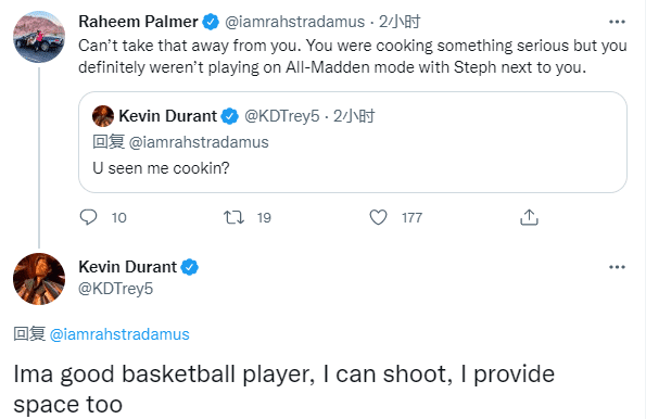 杜兰特又回应:哦,我看到了,我的兄弟,我很欣赏你的赞美,但我不同意你所说的双人包夹,仅此而已。我喜欢这个节目。