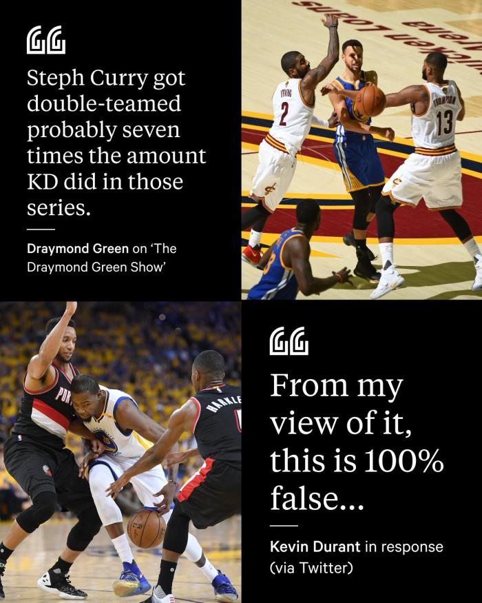 JRS直播网06月01日讯 ,格林在节目中表示杜兰特离开勇士是错误决定以及库里被包夹次数是KD的7倍,如此言论引热议,杜兰特本人回应格林的言论是错误的,之后格林发推提醒杜兰特别被引诱为推特冠军。