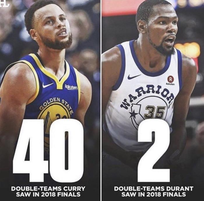 值得一提的是,有球迷晒数据图力挺格林——库里在2018年总决赛被包夹48次,杜兰特仅被包夹2次;之后杜兰特在推特上和球迷吵起来了。