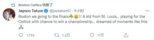 不久前,塔图姆发推写道:波士顿,我们进总决赛了!只是一个来自圣路易斯的孩子,为凯尔特人效力并有机会拿到冠军.,这是我一直梦寐以求的时刻!