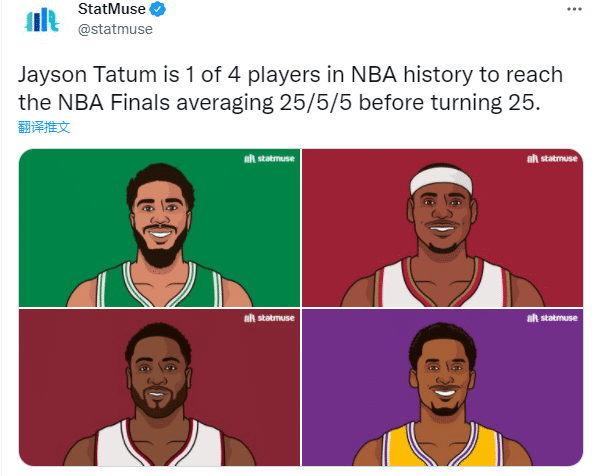 2、塔图姆成为科比、詹姆斯、韦德之后第4位在25岁以下场均25+5+5晋级总决赛的球员