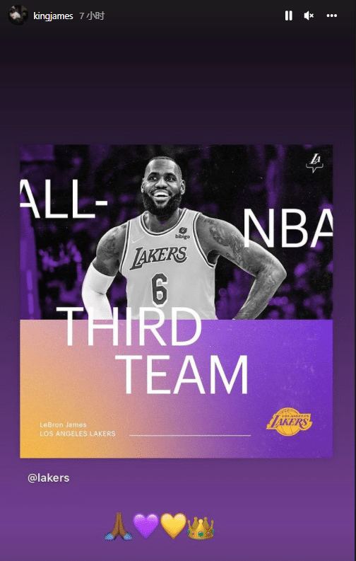 JRS直播网05月26日讯 湖人球星詹姆斯更新社交媒体,转发湖人官媒动态,庆祝自己入选最佳三阵;老詹先是转发湖人庆祝他入选最佳三阵的动态,配上爱心和王冠表情;湖人官方晒詹姆斯本赛季隔扣乐福、轰进三分以及大帽对手的精彩画面,并写道:史上第一位第19个赛季入选最佳阵容的球员,为国王欢呼!