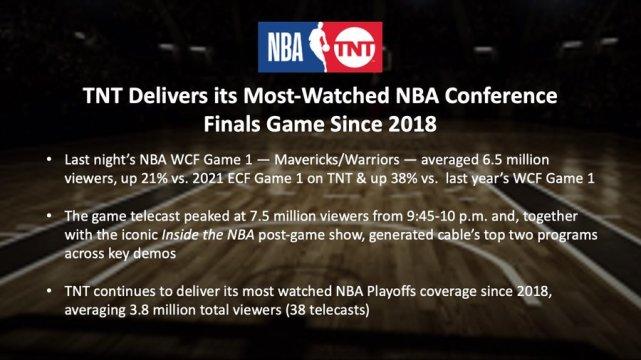 JRS直播网05月20日讯,TNT公布了西决首战的收视率。据报道,这场比赛的平均收视人数为650万人,比2021年的东决G1提升21%,比去年的西决G1提升38%。当地时间晚上9点45分至10点,收视人数来到最高的750万人,该场比赛与之后的《Inside the NBA》节目一起成为了当日有线电视频道中收视率最高的两档节目。
