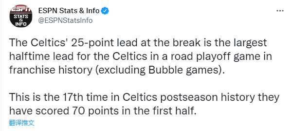 塔图姆半场拿到20分,布朗15分7篮板,凯尔特人半场领先25分创队史季后赛客场半场领先最高纪录(不算2020年复赛园区),也是队史第17次半场得分至少70+。