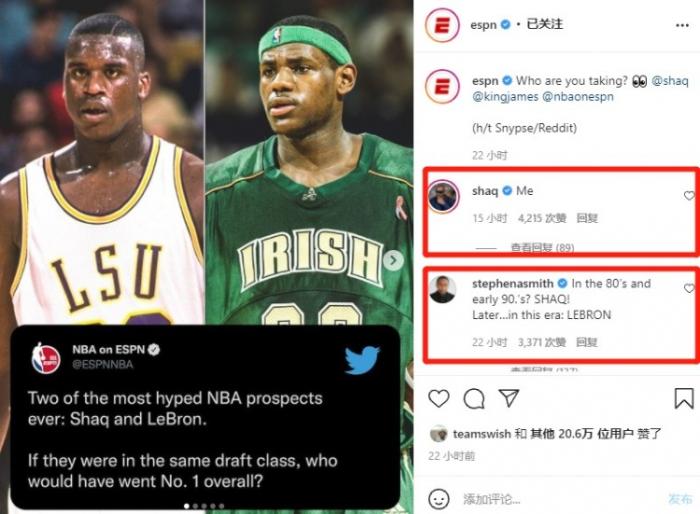 鲨鱼本人出现在了评论区,言简意赅“我”而名嘴斯蒂芬·A·史密斯则不认同,他表示“80年代和90年代早期?奥尼尔!在这个时代的后期...勒布朗。”这种帖子肯定火,因为讨论的是历史顶级的两位状元,都是各自时代的BUG,超一流的球员,荣誉无数,两人都手握4个总冠军,也都有MVP、FMVP等荣誉!