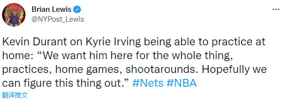 篮网和雄鹿赛后,杜兰特回应欧文获准归队参加训练,他表示:至少他还可以训练,但我的意思是,我们希望他能参与一切,我们希望他能打比赛,能出战主场比赛、训练、客场比赛、投篮训练,所有的一切。所以,希望我们能解决这事。
