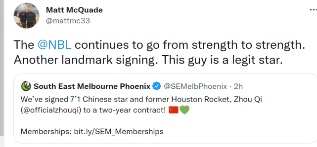 凤凰队的社媒也在不断更新周琦的信息,他们还晒出了周琦在国家队和火箭队的比赛视频以及照片,非常重视这笔签约。多位澳大利亚记者都发表了对凤凰签约周琦的看法,认为周琦会在NBL联赛成为一位合格的球星。你们认为周琦在NBL联赛会打出怎样的数据呢?