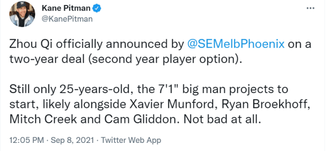JRS直播网9月08日讯,澳大利亚篮球记者Kane Pitman报道称,周琦和墨尔本凤凰签下了1+1的合同,第二年为球员选项。Kane Pitman采访NBL联赛多年,是ESPN澳洲站的篮球记者。他预测了凤凰队新赛季的首发阵容,新援周琦在列,另外四位是芒福德、布勒克霍夫、克里克和格利登。除了格利登,包括周琦在内的其他四位预测首发都曾在NBA效力。