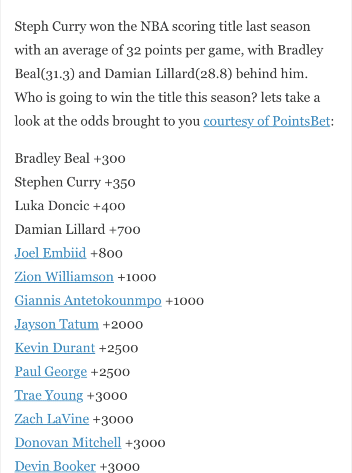 最后这个球员就是比尔了,比尔可以说是一个得分王竞争中的可怜人,他连续两个赛季都拿到了30+的得分,然而他却一次得分王都没拿过。之前被哈登击败,上赛季又被库里击败,不过对于新赛季的情况来说,拥有无限开火权的比尔仍然是最有可能拿到得分王的球员。+300的赔率达到了第一名,只要他可以保持上两个赛季的实力,得分王绝对不成问题。