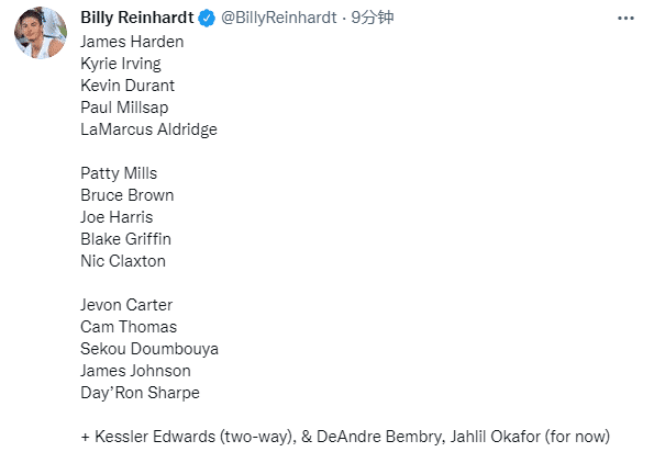 篮网跟队记者Billy Reinhardt晒出篮网18人大名单——杜兰特、哈登、欧文、米尔萨普、阿德、米尔斯、小布朗、乔-哈里斯、克拉克斯顿、杰文-卡特、詹姆斯-约翰逊、卡姆-托马斯、夏普和敦布亚,还有本布里和奥卡福以及双向合同球员爱德华兹。