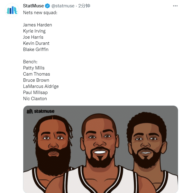 美媒StatMuse预测篮网新阵容的首发和替补,首发五虎是杜兰特、哈登、欧文、格里芬和乔-哈里斯,替补阵容是米尔斯、小布朗、米尔萨普、阿德、克拉克斯顿和托马斯。