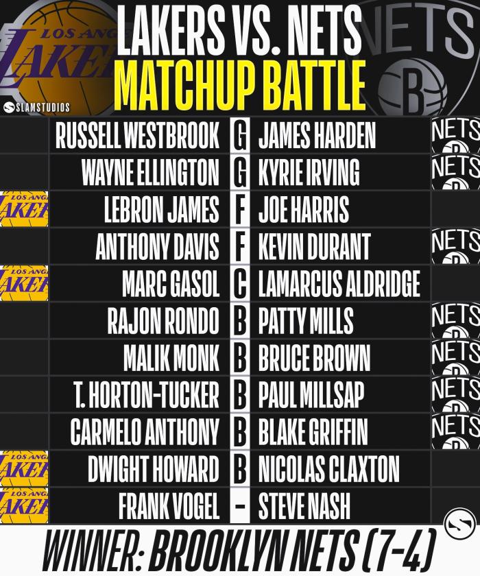由于湖人和篮网两队核心阵容确定下来,美媒SLAMSTUDIOS对比两队阵容——哈登对位威少、欧文对位艾灵顿、乔哈对位詹姆斯、杜兰特对位浓眉、阿德对位小加、米尔斯对位朗多、小布朗对位蒙克,米尔萨普对位霍顿-塔克、格里芬对位安东尼、克拉克斯顿对位霍华德、纳什对位沃格尔。
