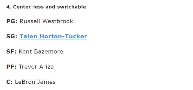 控卫:威斯布鲁克;分卫:霍顿-塔克;小前:贝兹莫尔;大前:阿里扎;中锋:詹姆斯