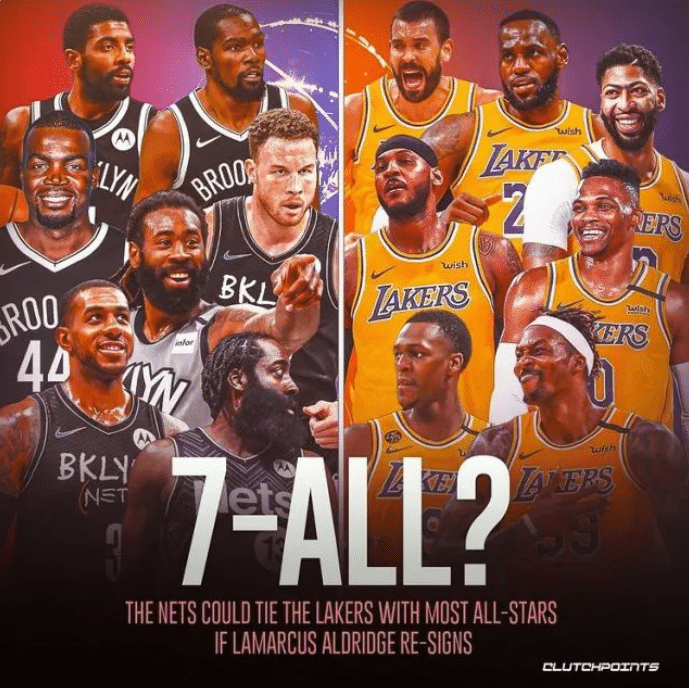 算上阿德的话,篮网新的大名单之中有6名全明星球员——杜兰特(11次)、哈登(9次)、欧文(7次)、格里芬(6次)、米尔萨普(4次)、阿德(7次),总共44次入选全明星;与篮网形成鲜明对比的是洛杉矶湖人,拥有7位全明星球员,59次入选全明星,另外要说的是15年的全明星球员之中,有11人为篮网和湖人效力。