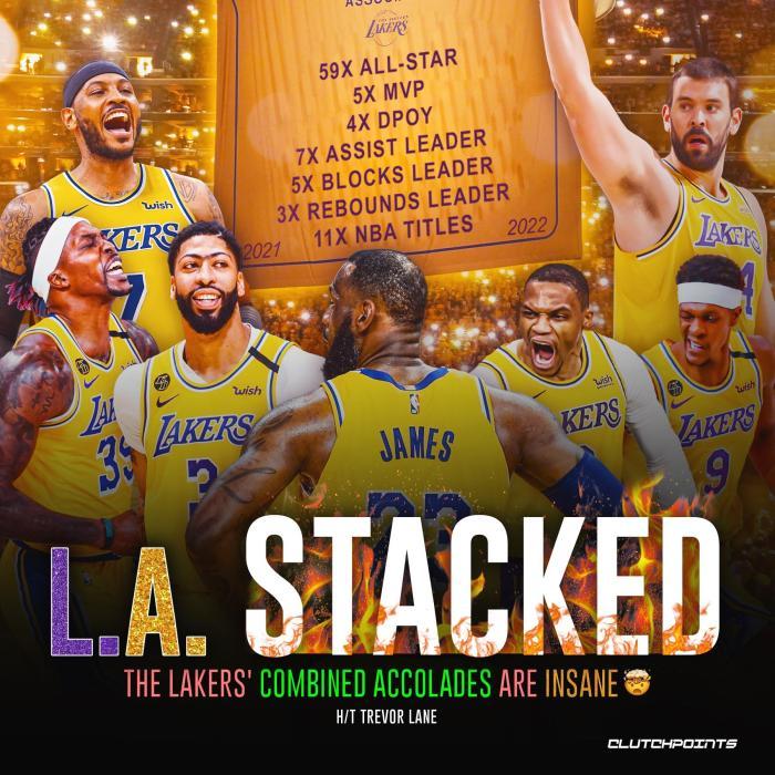 湖人队拥有7位全明星球员——詹姆斯(17次)、浓眉(8次)、威少(9次)、霍华德(8次)、安东尼(10次)、朗多(4次)和小加索尔(3次),他们7人总共59次入选全明星阵容,并且11次夺得总冠军、还有5次MVP、4次DPOY、7次助攻王、5次盖帽王和3次篮板王。
